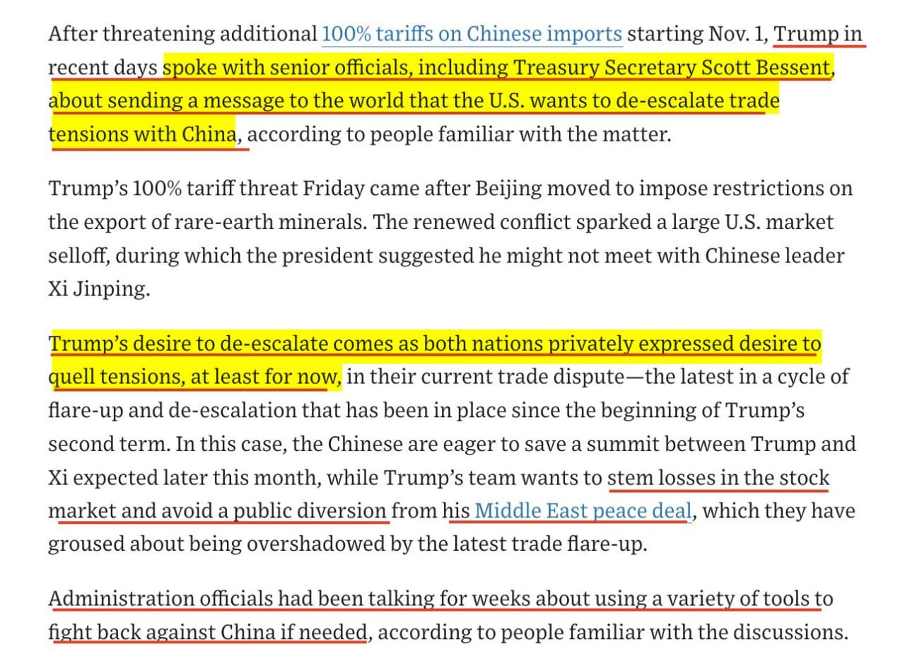 We’re seeing a tug-of-war between renewed risk-off selling and tentative hopes for de-escalation in the US–China trade spat. Equities have dipped into a familiar wash-out mid-week, but our base case is that any near-term slide in the S&P will be met with dip-buyers ahead of the Nov 1 tariff deadline. Gold remains in a strong momentum rally—with its characteristic Monday pump, mid-week suck-out and Friday break-out—and continues to benefit from safe-haven flows despite talk of a thaw in trade tensions. The dollar has held up impressively through a partial government shutdown, while JPY and CHF are trading strictly as risk-sentiment proxies (stronger on fresh escalations, softer on each round of verbal détente). We expect elevated volatility into the weekend, with AUD and NZD most vulnerable on risk-off moves and crypto playing out as a leveraged risk-on proxy.
